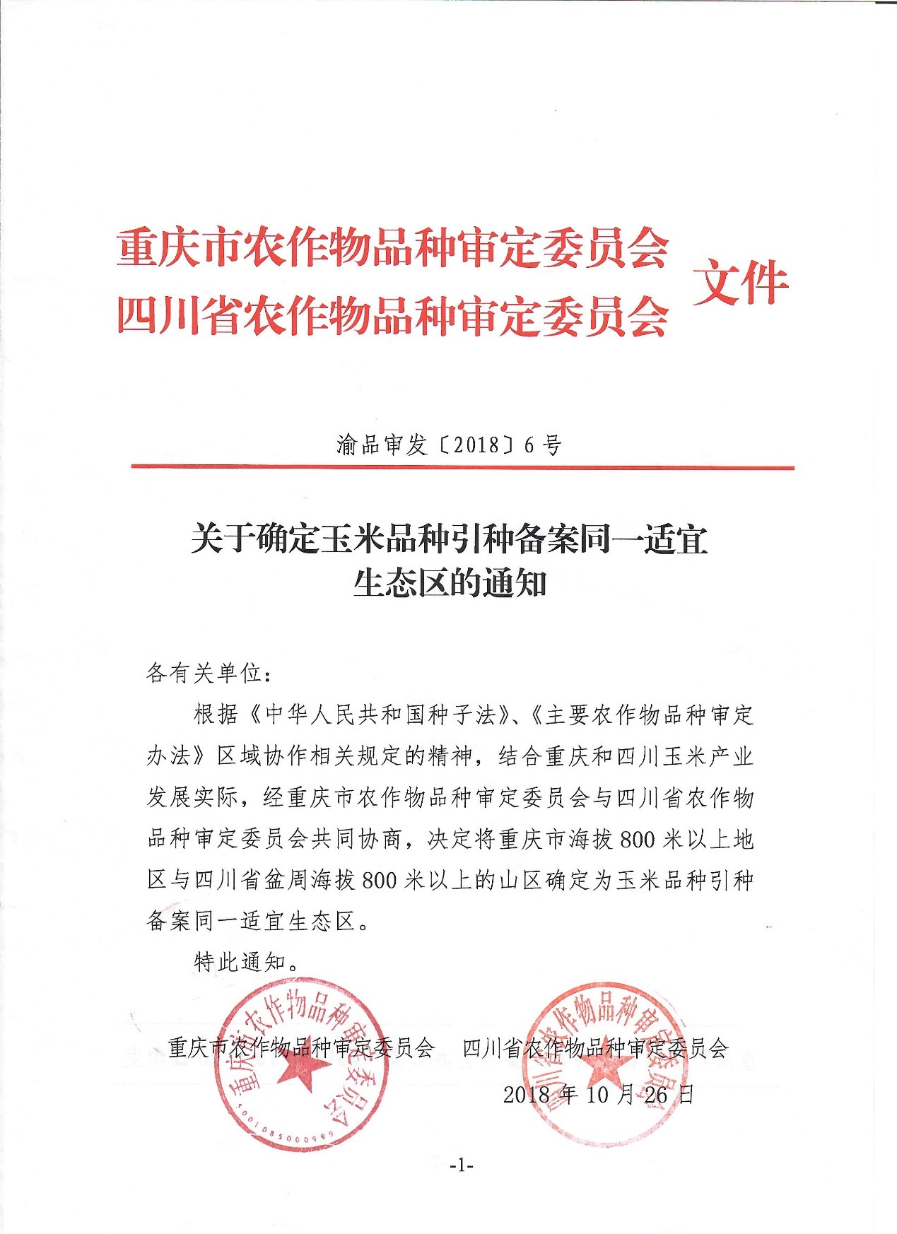 根据《中华人民共和国种子法》、《主要农作物品种审定办法》区域协作相关规定的精神,结合重庆和四川玉米产业发展实际,经重庆市农作物品种审定委员会与四川省农作物品种审定委员会共同协商,决定将重庆市海拔800米以上地区与四川省盆周海拔800米以上的山区确定为玉米品种引种备案同一适宜生态区。