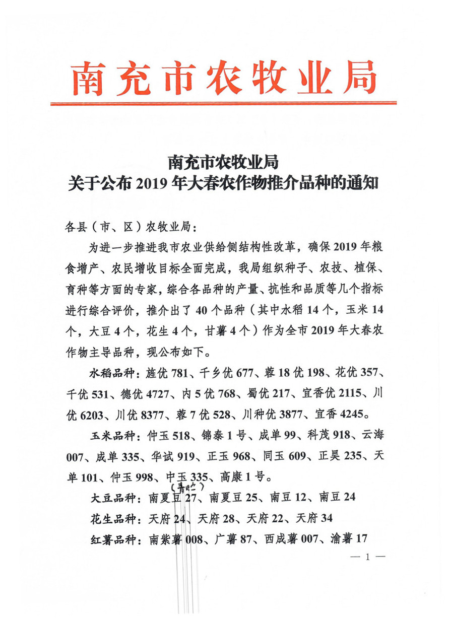 为进一步推进全市农业供给侧结构性改革,确保2019年粮食增产、农民增收目标全面完成,南充市农牧业局组织种子、农技、植保、育种等方面的专家,综合各品种的产量、抗性和品质等几个指标进行综合评价,推介出了40个品种(其中水稻14个,玉米14个,大豆4个,花生4个,甘薯4个)作为全市2019年大春农作物主导品种,现公布如下:水稻品种:旌优781、千乡优677、蓉18优198、