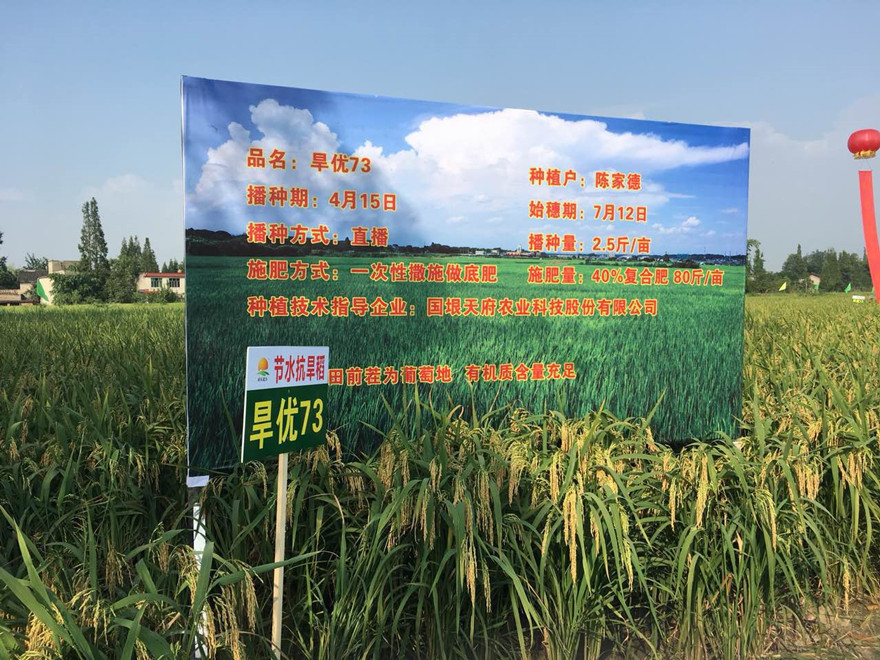 旱优73是由上海市农业生物基因中心与上海天谷生物科技股份有限公司共同选育的三系籼型杂交节水抗旱稻新组合,2014年通过安徽省农作物品种审定委员会审定。2016江西批准引种、2017年河南批准引种、2018年湖南、浙江批准引种。经过近几年在沿淮地区的试种示范,表现出抗旱性强、生育期适中、产量高、米质优、适应性广的特点。近日,四川国垠天府农业科技股份