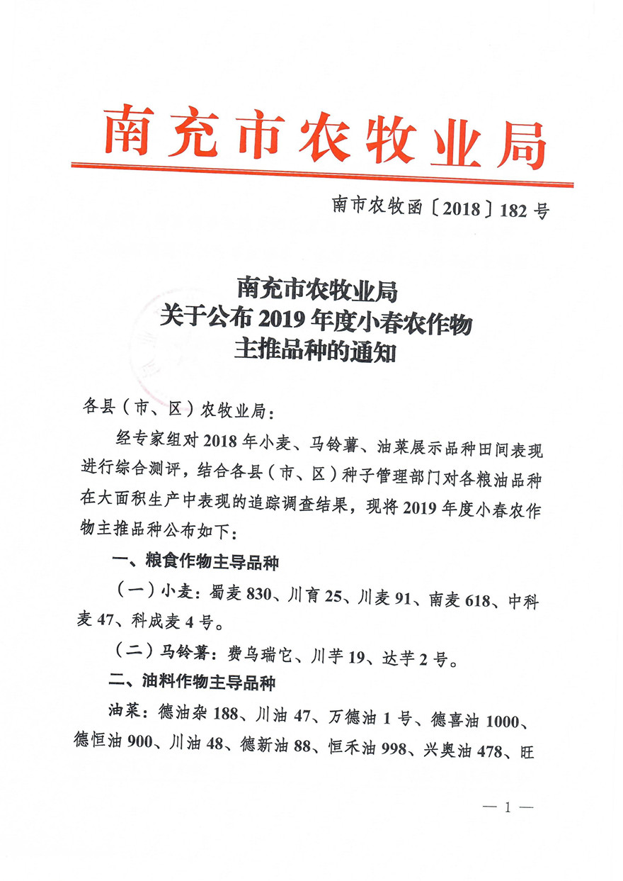 近日,南充市农牧业局组织专家对2018年小麦、马铃薯、油菜展示品种田间表现进行综合测评,结合各县(市、区)种子管理部门对各粮油品种在大面积生产中表现的追踪调查结果,发布了2019年度小春农作物主推品种。一、粮食作物主导品种(一)小麦:蜀麦530、川育25、川麦91、南麦618、中科麦47、科成麦4号(二)马铃薯:费乌瑞它、川芋19、达芋2号二、油料作物主导品